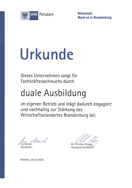 Potsdam, Januar 2026 – Wir freuen uns, von der IHK Potsdam mit einer Urkunde für unser Engagement in der dualen Ausbildung ausgezeichnet worden zu sein. Diese Ehrung bestätigt unser Bestreben, junge Talente praxisnah auszubilden und sie bestmöglich auf die berufliche Zukunft vorzubereiten.